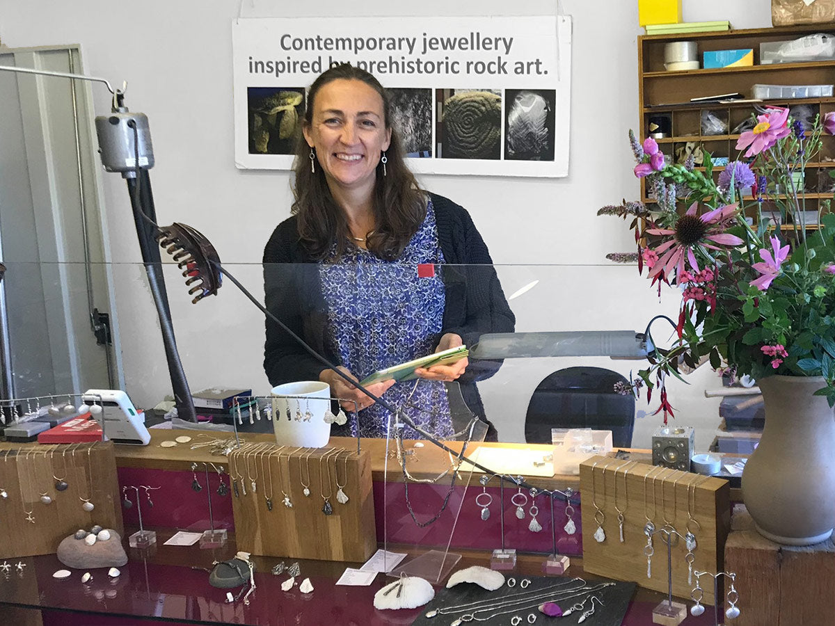 Carol's jewellery often reflects her archaeological passion, particularly her explorations of prehistoric rock art. From the initial rock art jewellery collection inspired by the Bachwen burial chamber in North Wales to later pieces influenced by her travels through Italy, Galicia, and Norway, each creation tells a story.